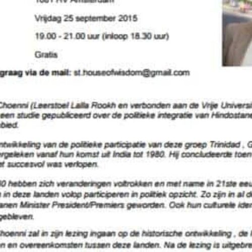 House of Wisdom organiseert op 25 september de lezing ‘Van marginalisatie tot politieke participatie; Hindostanen in Trinidad, Guyana en Suriname’ Gastspreker: Prof. C.Choenni (Vrije Universiteit Amsterdam) Locatie: Hoofdgebouw VU (HG-1D06 Vergaderzaal 1) De Boelelaan 1106, 1081 HV Amsterdam Datum: Vrijdag 25 september 2015 Tijd: 19.00 – 21.00 uur (inloop 18.30 uur) Toegang: Gratis Aanmelden graag […]