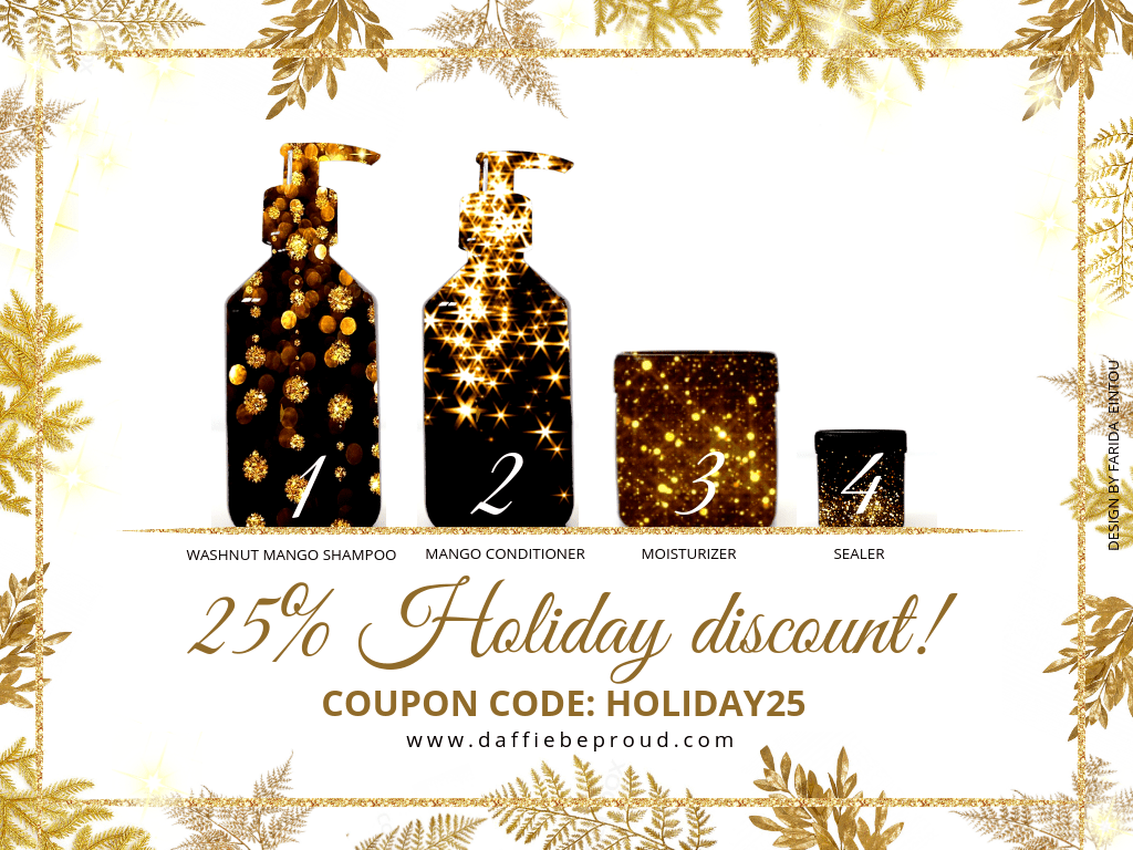 De kou in december is funest voor mensen vanaf type 3 haar, maar daar hebben Farida en Daphne wat op: de AfroGold leave-in conditioner en de hele lijn van Daffie Be Proud zijn afgeprijsd deze feestdagen! Met maar liefst 25% korting in de webshop! Koop ze helemaal leeg!